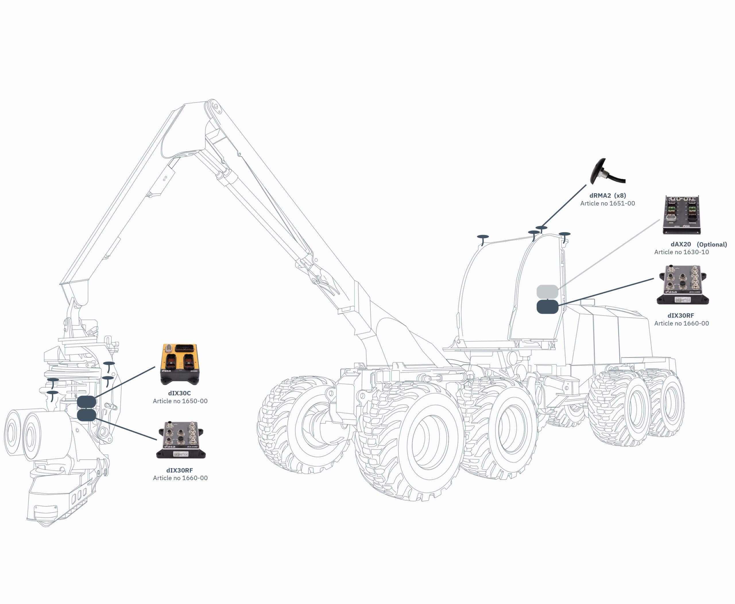 Total freedom. This gives you total freedom to move the crane or boom and rotate the head without any risk of communication failure. The Dasa Wireless 1 is flexible – and designed to fit all types of carrier machines. Mounting and changing the harvester head is also quicker and more straightforward.